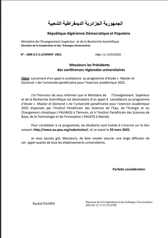 Lancement d’un appel à candidature au programme d’étude « Master et Doctorat » de l’université panafricaine pour l’exercice académique 2025