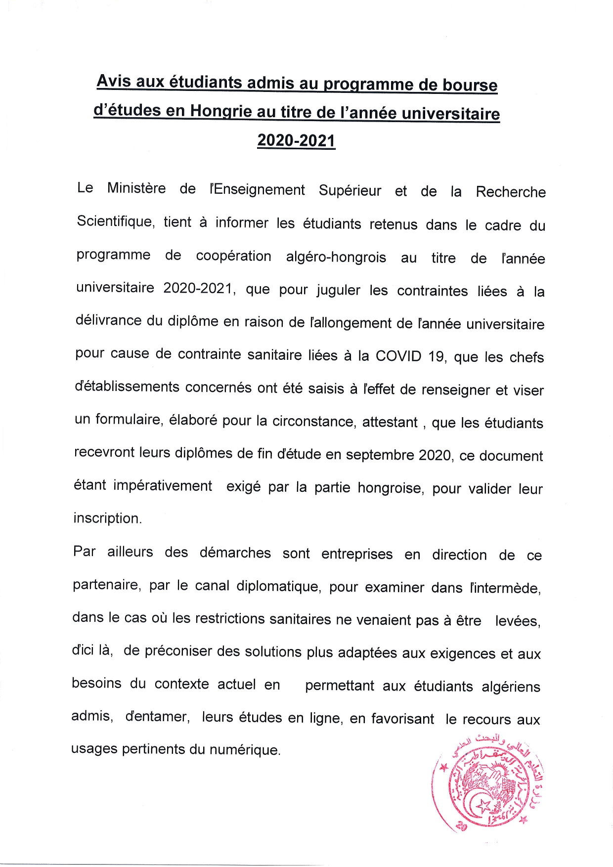 Avis aux étudiants admis au programme de bourse d’études en Hongrie au titre de l’année 2020-2021 2020-07-22 | Université