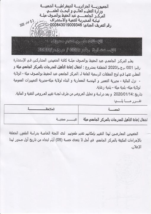 الإعلان عن عدم جدوى الإستشارة رقم 001/م.ج.م/2020