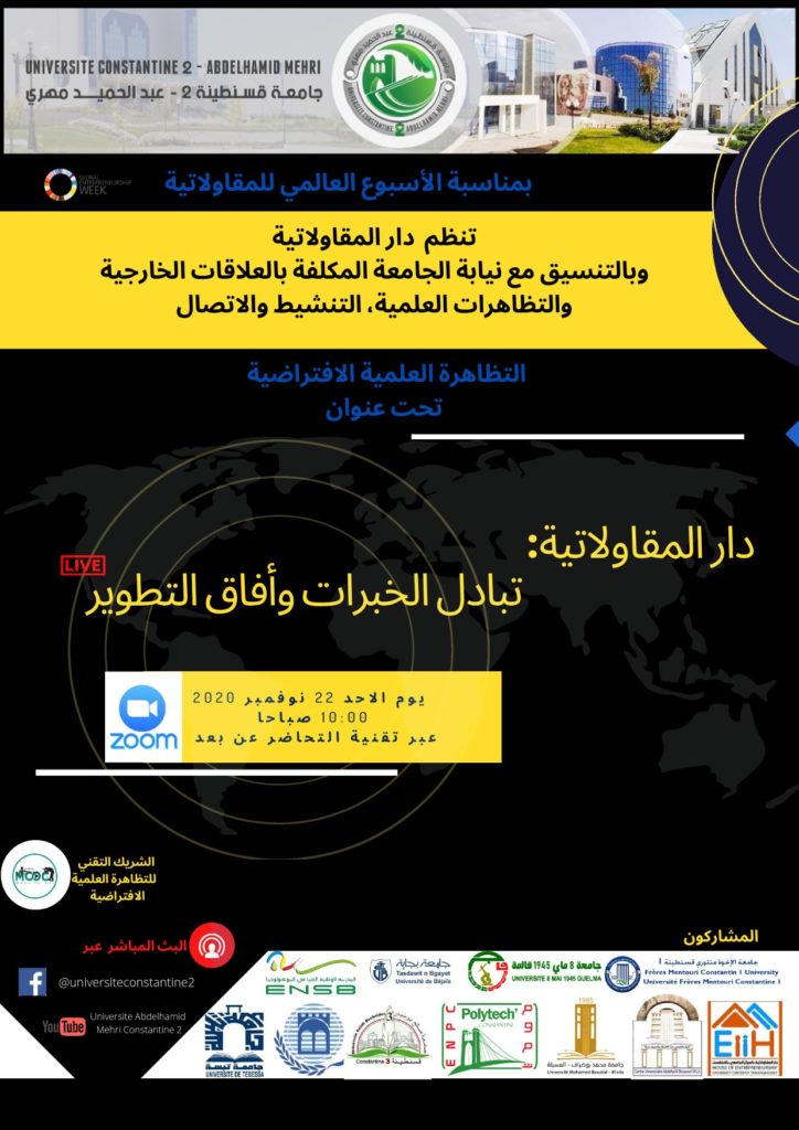 في إطار الاحتفال بالأسبوع العالمي للمقاولاتية يشارك المركز الجامعي عبد الحفيظ بوالصّوف –ميلة- ممثّلا في دارا المقاولاتية، ومكتب ربط الجامعة بالمؤسسات، في فعاليات التظاهرة العلمية الافتراضية التي تنظّمها جامعة قسنطينة 02 تحت عنوان :”دار المقاولاتية الجامعيّة: تبادل الخبرات وآفاق التّطوير”، وذلك يوم: 22 نوفمبر 2020، عبر تقنية التّحاضر عن بُعد (ZOOM ).