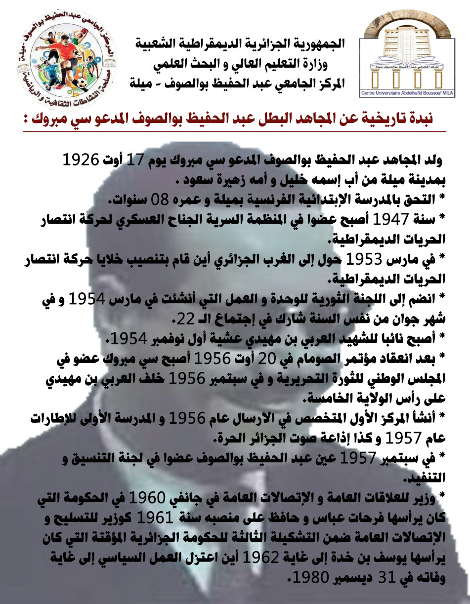 يتقدّم السيد مدير المركز الجامعي عبد الحفيظ بوالصوف، ميلة؛ الدكتور عميروش بوشلاغم، باسمه الخاص، وباسم الأسرة الجامعية كافة بأسمى عبارات التقدير والتبجيل، إلى عائلة المجاهد البطل (عبد الحفيظ بوالصوف) بمناسبة حلول أربعين سنة من وفاته؛ هذا المجاهد الذي عرف بنضاله السّياسي، وإيمانه بالشّهادة فكان الرّمز التاريخي الثّائر والشعار الزاهر؛ فأنعم به من شهيد!