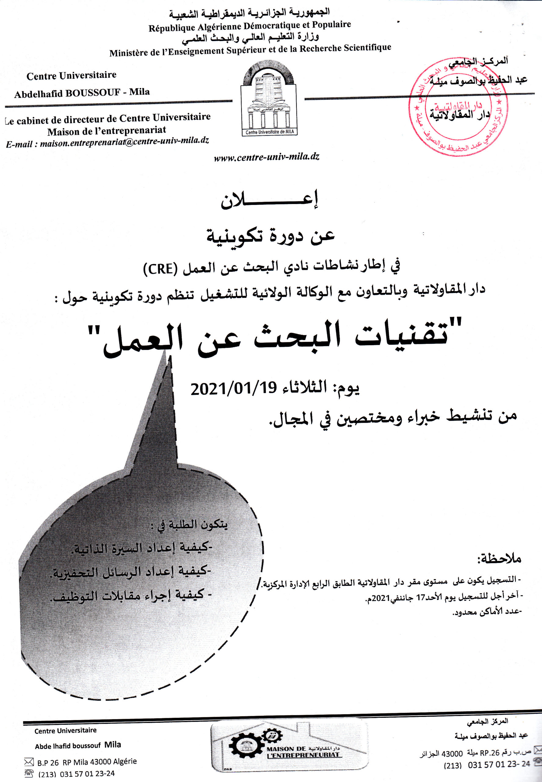دورة تكوينية : تقنيات البحث عن العمل يوم الثلاثاء 19 جانفي 2021 2021-01-18 | إعلانات للطلبة . دار المقاولاتية