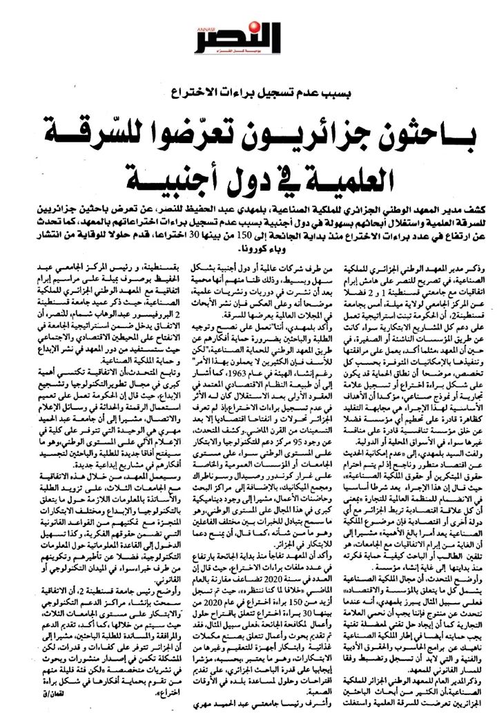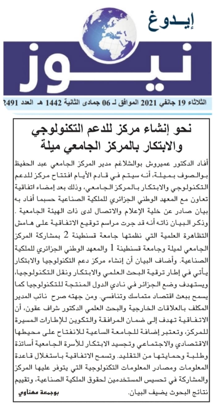 إبرام اتفاقية تعاون بين المركز الجامعي ميلة والمعهد الوطني الجزائري للملكية الصناعية بعيون الصحافة دوام الرقي لمركزنا الجامعي 2021-01-19 | تغطية إعلامية
