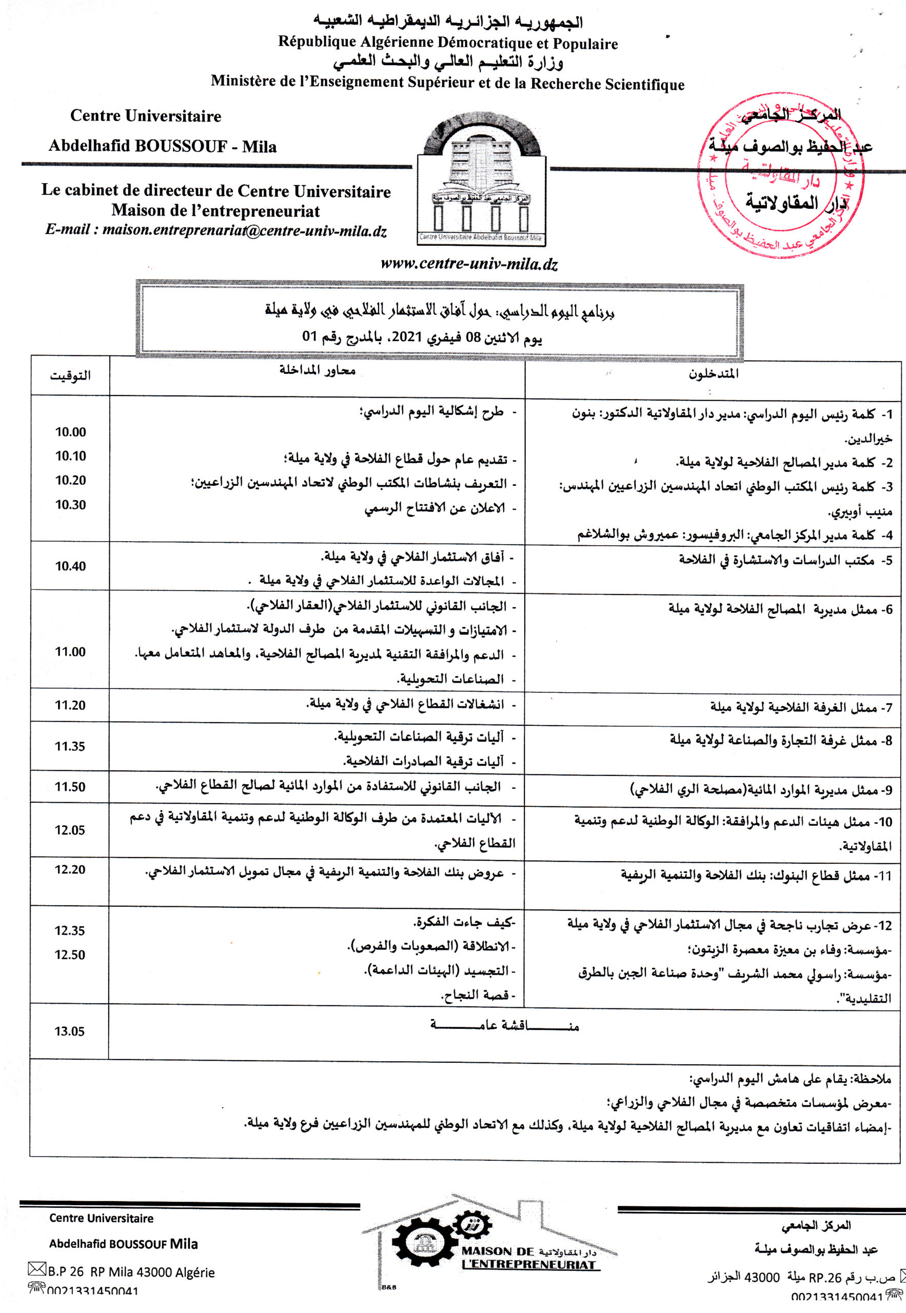 برنامج اليوم الدراسي الثالث حول : ” آفاق الاستثمار الفلاحي في ولاية ميلة”