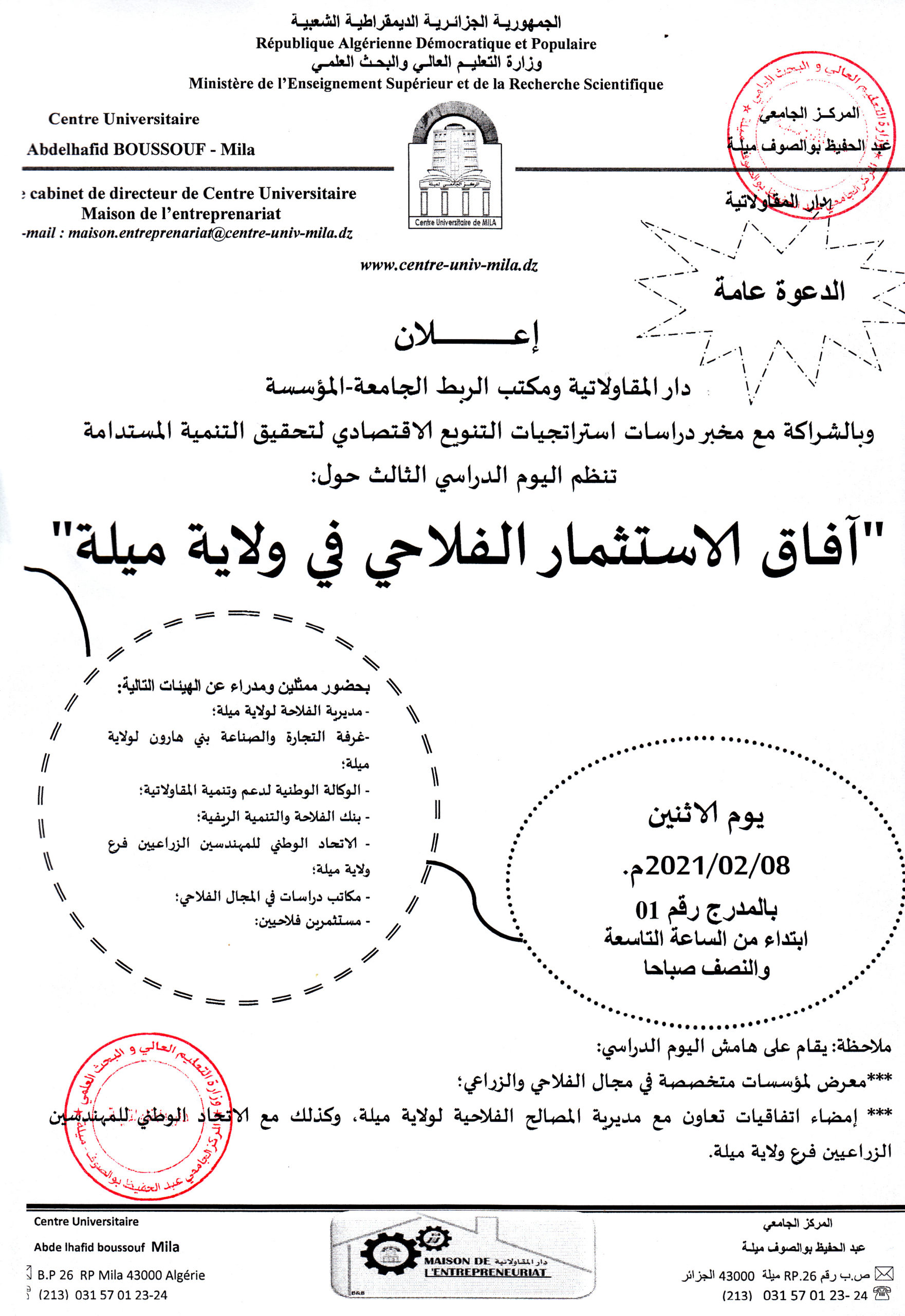 دار المقاولاتية ومكتب الربط الجامعة-المؤسسة وبالشراكة مع مخبر دراسات استراتيجيات التنويع الإقتصادي لتحقيق التنمية المستدامة ، تعلن عن انعقاد اليوم الدراسي الثالث حول : ” آفاق الاستثمار الفلاحي في ولاية ميلة”