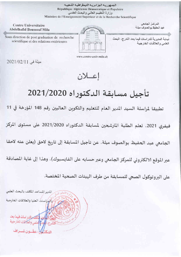 إعلان فيما يخص تأجيل مسابقة الدكتوراه 2020/2021 2021-02-13 | إعلانات للطلبة . معهد الإقتصاد . معهد التكنولوجيا