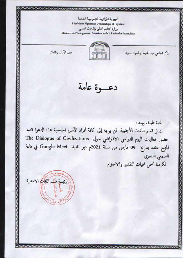 برنامج اليوم الدراسي الوطني الموسوم ب” The Dialogue of Civilizations” يعلن قسم اللغات الاجنبية عن تنظيم يوم دراسي وطني موسوم ب“The Dialogue of Civilizations” وذلك يوم 09 مارس 2021 عبر تقنية google meet برنامج اليوم الدراسي : اضغط هنا 2021-03-07 | العلاقات الخارجية