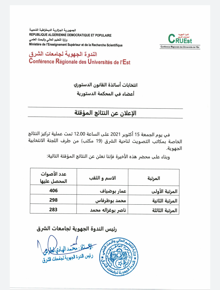 تم تبليغ ادارة المركز الجامعي عبد الحفيظ بوالصوف_ميلة النتائج الرسمية لانتخاب اساتذة اعضاء في المحكمة الدستوريةمن طرف الندوة الجهوية لجامعات الشرق الجزائري ، وفي هذا الصدد يتقدم مدير المركز الجامعي بالتهاني والتبريكات للاستاذين عمار بوضياف و محمد بوطرفاس متمنيا لهما النجاح في مهامهما .