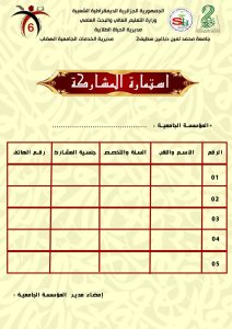 ترسل الطلبات مع إستمارة المشاركة إلى نيابة المديرية للدراسات فيما بعد التدرج، البحث العلمي والعلاقات الخارجية قبل 31 مارس 2022.