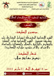 في إطار سنة الاحتفال بستينية عيد الاستقلال، وتزامنا مع احتفالات عيد النصر “19 مارس 2022” وتمكينا للطلبة من المشاركة في مختلف الأنشطة الوطنية المسطرة فإن جامعة محمد لمين دباغين سطيف 02 ، تعتزم تنظيم الطبعة السادسة للمسابقة الوطنية للإبداع الطلابي “الشعر”، لفائدة الطلبة في الفترة الممتدة من 18 فيفري إلى 31 مارس 2022 تحت شعار “نعيش معا في سلام”،
