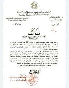 تهنئة وزير التعليم العالي والبجث العلمي للأسرة الجامعية بمناسبة ذكرى عيد الاستقلال والشباب 2022 2022-07-05 | الجامعة