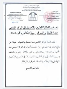 نتائج دراسة طلبات التحويل إلى المركز الجامعي- بكالوريا قبل 2022 معهد العلوم الاقتصادية اضغظ هنا معهد العلوم و التكنولوجيا اضغظ هنا الاداب و اللغات الاجنبية اضغظ هنا حقوق اضغظ هنا 2022-09-26 | إعلانات للطلبة . الدراسات في التدرج