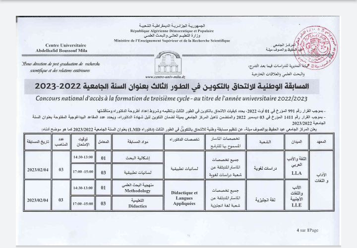 إعلان المسابقة الوطنية للالتحاق بالتكوين في الطور الثالث دكتوراه 2022-2023 2022-12-09 | العلاقات الخارجية . طور الدكتوراه