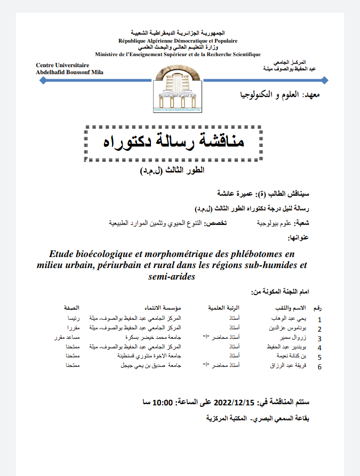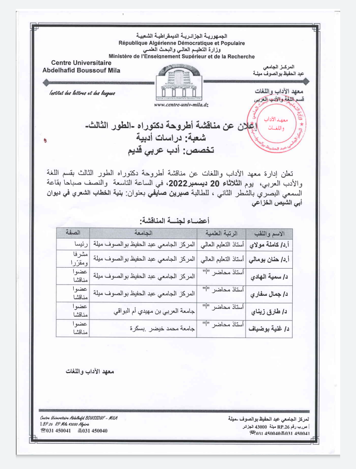 اعلان عن مناقشة أطروحة دكتوراه الطور الثالث