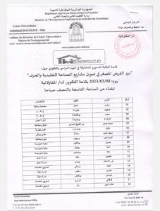 برنامج وقائمة الطلبة المدعويين للمشاركة في اليوم الدراسي والتكويني حول:دور القرض المصغر في تمويل مشاريع الصناعة التقليدية والحرف يوم 08 مارس 2023 بقاعة التكوين لدار المقاولاتية على الساعة 09:30