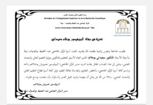 تعزية تعزية في وفاة البروفيسور بوعلام سعيداني المدير العام الأسبق للتعليم والتكوين بوزارة التعليم العالي والبحث العلمي 2023-03-11 | الجامعة