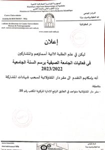دار المقاولاتية: إعلان للطلبة لسحب شهادات المشاركة في الجامعة الصيفية بعنوان السنة الجامعية 2022-2023 2023-07-13 | العلاقات الخارجية . دار المقاولاتية