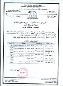 إعلان عن مناقشة أطروحة الدكتوراه بمعهد الآداب واللغات للطالبة – نجاة مشيتوة 2023-10-15 | العلاقات الخارجية