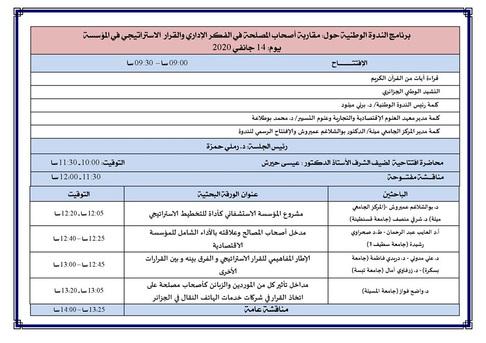 ندوة وطنية بعنوان أصحاب المصلحة في الفكر جانب من فعاليات الندوة الوطنية بعنوان أصحاب المصلحة في الفكر الاداري و القرار الاستراتجي في المؤسسة حيث تم تنشيطها اليوم حسب البرنامج التالي 2020-01-14 | إعلانات للأساتذة . إعلانات للطلبة . العلاقات الخارجية . مؤتمرات و ملتقيات . معهد الإقتصاد