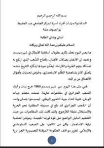 كلمة مدير المركز الجامعي عبد الحفيظ بوالصوف ميلة بمناسبة ذكرى 11 ديسمبر1960