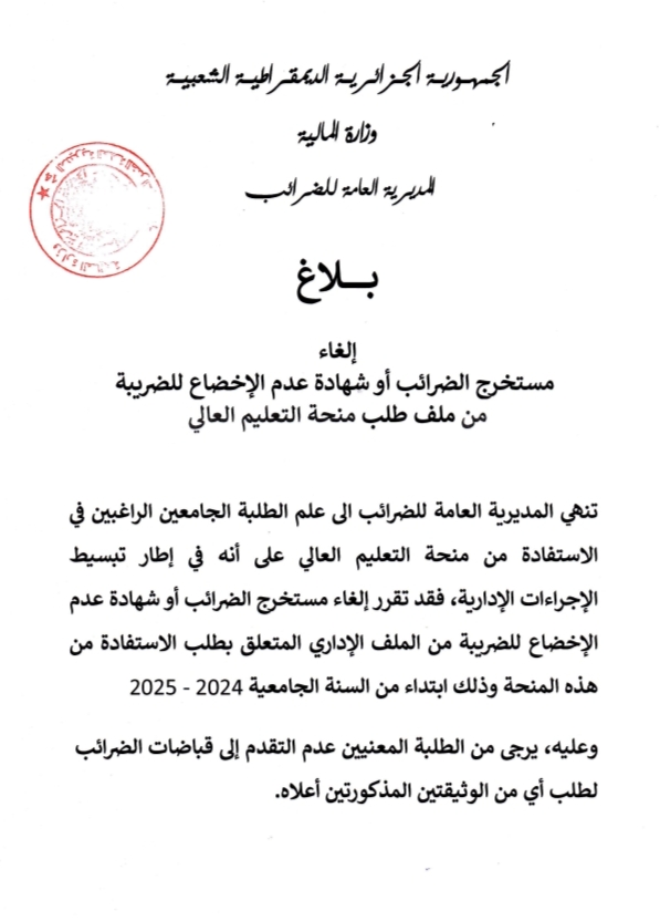 إلغاء مستخرج الضرائب وشهادة عدم الإخضاع للضريبة 2024-07-30 | الجامعة . الدراسات في التدرج . بكالوريا 2024