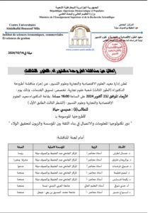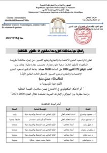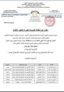 إعلان عن مناقشات لأطروحة الدكتوراه بمعهد العلوم الاقتصادية، التجارية وعلوم التسيير 2024-10-21 | العلاقات الخارجية