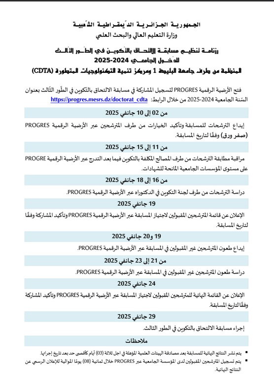 مسابقة استثنائية للدكتوراه جامعة سعد دحلب البليدة1 بالشراكة مع مركز تنمية التكنولوجيا المتطورة CDTA لتحميل المرفقات اضغظ هنا 2025-01-02 | العلاقات الخارجية