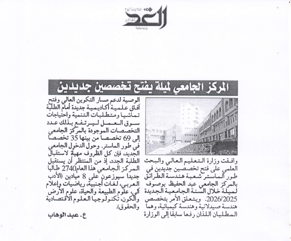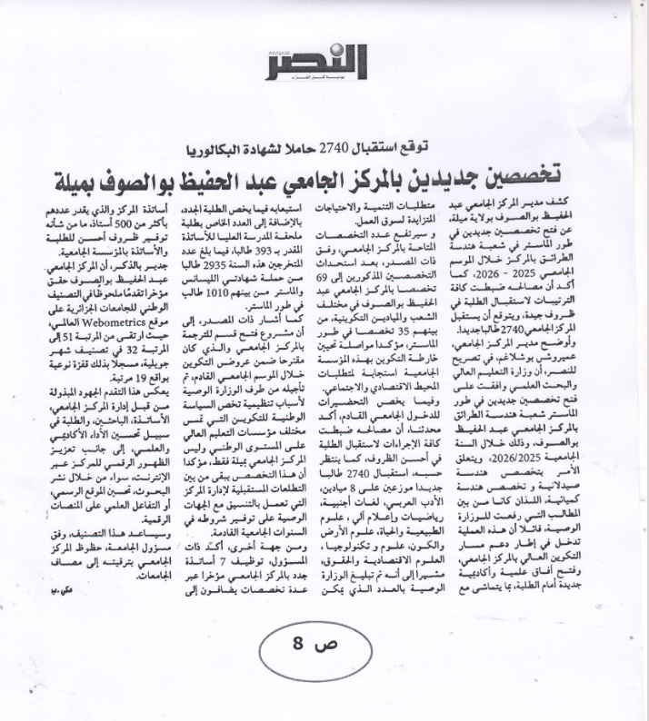 تغطية إعلامية حول قرار وزارة التعليم العالي والبحث العلمي المتعلق بفتح تخصصين جديدين في طور الماستر على مستوى المركز الجامعي عبد الحفيظ بوالصوف – ميلة.