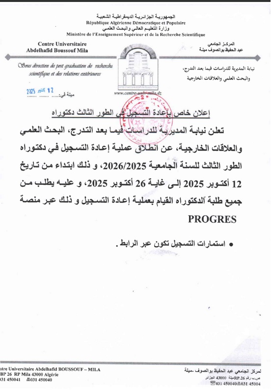 إعلان إعادة التسجيل لطلبة الطور الثالث دكتوراه إعلان إعادة التسجيل لطلبة الطور الثالث دكتوراه للسنة الجامعية 2025/2026 اضغظ هنا 2025-10-12 | العلاقات الخارجية