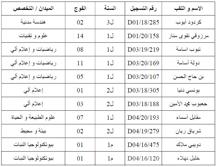 على الطلبـــة الآتيــــة أسمائهم التقرب من أمانة معهد العلوم و التكنولوجيا (الشطر الأول الطابق الخامس) قبل تاريخ الأحد 23 فيفري 2020 و ذلك لأمر يهمهم.