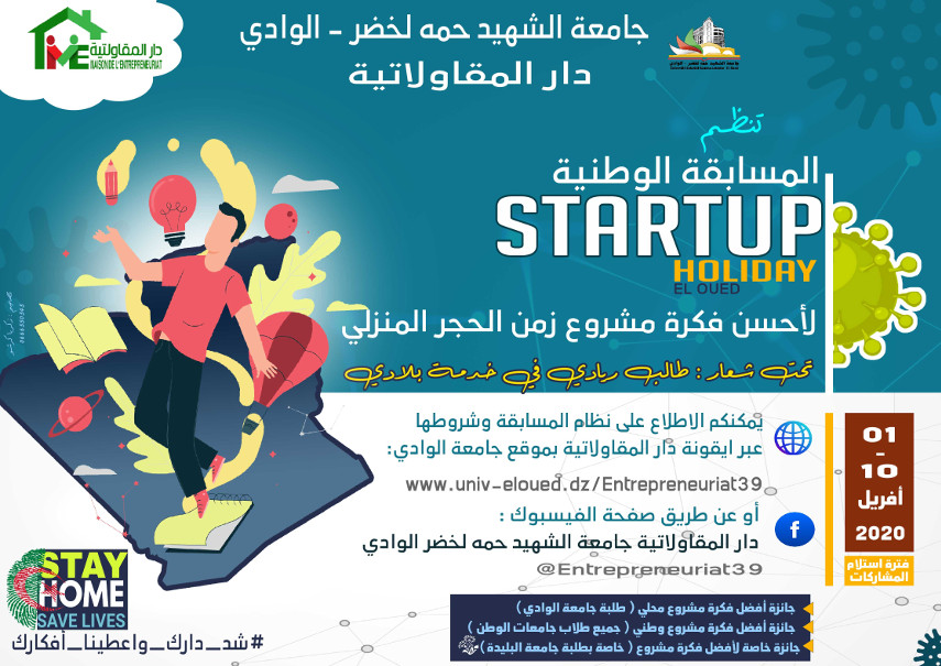 تسعى دار المقاولاتية بجامعة الشهيد حمه لخضر بالوادي، إلى المساهمة في عملية التحسيس بالبقاء في البيوت، وتتوجه للطلبة الجامعيين بمختلف تخصصاتهم ومستوياتهم ومؤسساتهم الجامعية بهذا النشاط المنزلي في ظل الحجر وفي ظل العطلة، الذي نريد منه إظهار أصحاب الأفكار الريادية والمشاريع الناشئة ليطوروا نماذجهم ويقدموا حلولهم وإسهاماتهم في هذا الوقت الحساس، ولنقدم نموذج الطالب الريادي المسؤول اجتماعيا.