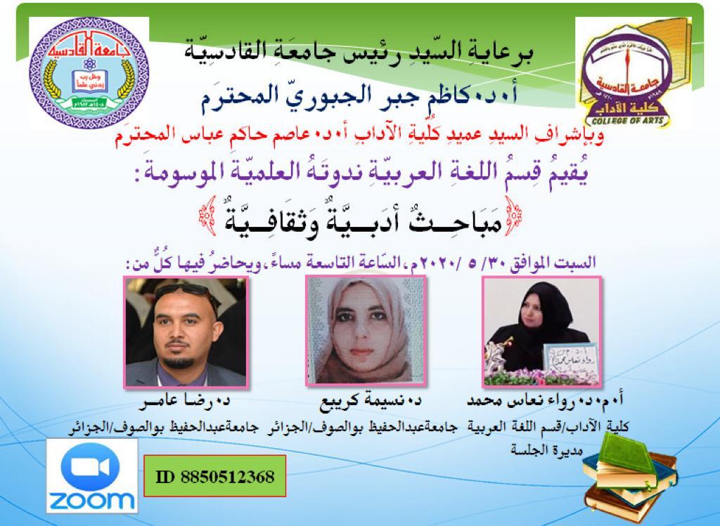 دعمًا لسياسة جامعة عبد الحفيظ بوالصّوف -ميلة- في الانفتاح على العالم؛ تفضّل الأستاذان الفاضلان؛ الدّكتور رضا عامر؛ والدكتورة نسيمة كريبع من قسم الآداب واللّغات بالمشاركة في فعاليات النّدوة العلميّة الدّولية بجامعة القادسيّة بالعراق الشّقيق؛ والموسومة بعنوان: “مباحث أدبيّة وثقافيّة” وذلك عبر تقنية التحاضر المرئي عن بُعد.