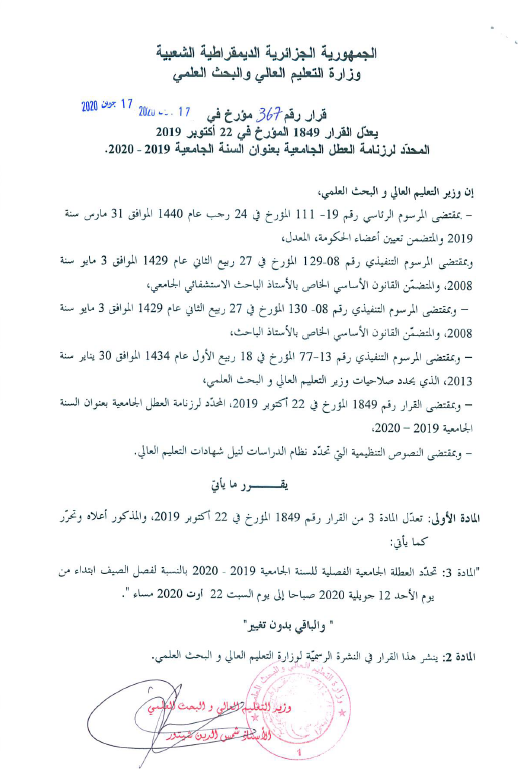 قرار رقم 367 المؤرخ في 17 جوان 2020 2020-06-17 | إعلانات للأساتذة . إعلانات للطلبة . إعلانات مهمة . الجامعة