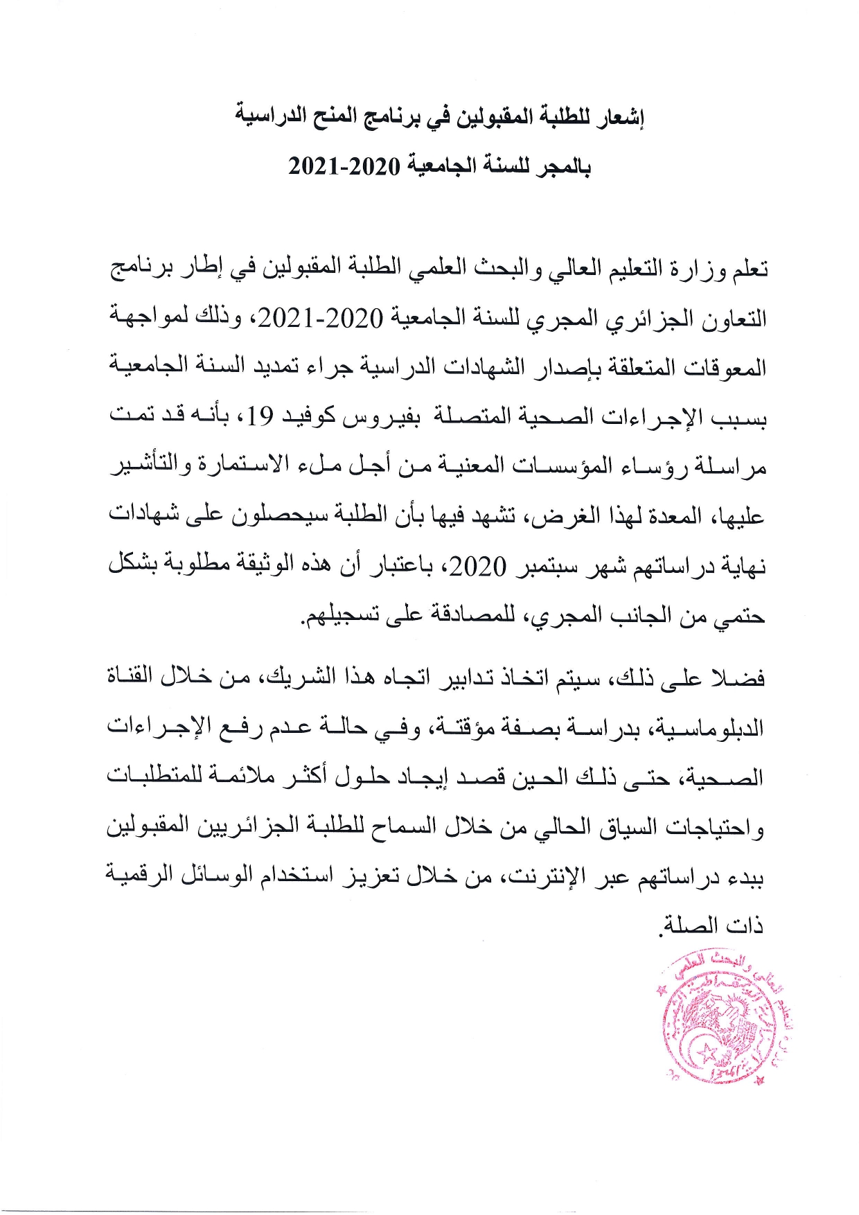 اشعار للطلبة المقبولين في برنامج المنح الدراسية بالمجر للسنة الجامعية 2020-2021