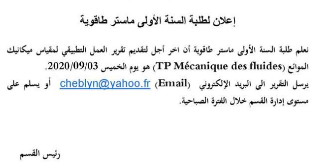 إعلان لطلبة السنة الاولى ماستر طاقوية