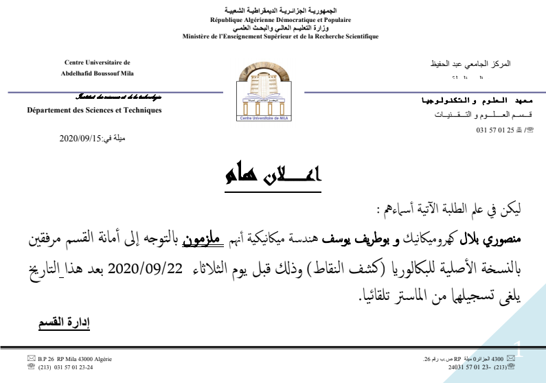 تنهي إدارة قسم علوم و تقنيات إلى علم الطلبة المقبلين على التخرج طور الليسانس تخصص ري أن إيداع ملفات الحصول على شهادة التخرج سيكون ابتداء من يوم الثلاثاء 15 سبتمبر 2020 إلى غاية يوم الخميس 17 سبتمبر 2020 على مستوى إدارة القسم.
