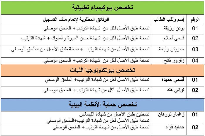 ليكن في علم الطلبة الآتية أسماؤهم أنه عليهم التقدم إلى إدارة قسم علوم الطبيعة والحياة مرفقين بالوثائق الخاصة بإتمام ملف التسجيل في الماستر1