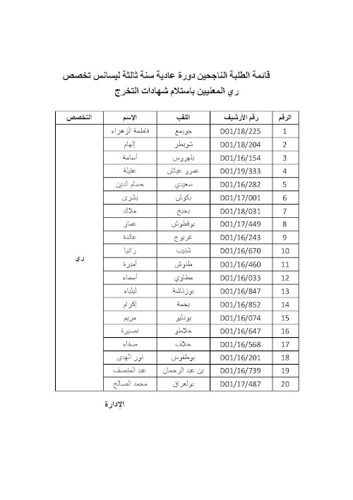 تنهي إدارة معهد العلوم و التكنولوجيا إلى علم الطلبة ليسانس الدفعة المتخرجة (تخصص ري) الآتية أسماؤهم، أنه سيشرع في تسليم شهادات تخرجهم على مستوى إدارة المعهد الطابق الخامس (5) مكتب رقم (21) ابتداء من تاريخ الأحد 20 سبتمبر 2020 على الساعة التاسعة صباحا.