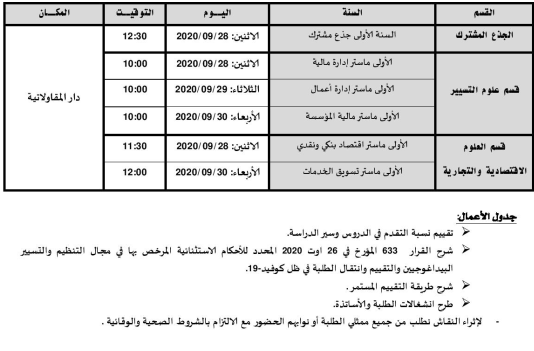 رزنامة إجتماعات اللجـان البيداغوجيــة معهد العلوم الاقتصادية و التجارية و علوم التسيير- رزنامة إجتماعات اللجـان البيداغوجيــة نعلم جميع ممثلي طلبة السنة الأولى ليسانس و ماستر بتخصصاته انه تقرر عقد اجتماعات اللجان البيداغوجية وفق الرزنامة الموالية: 2020-09-24 | إعلانات للطلبة . معهد الإقتصاد