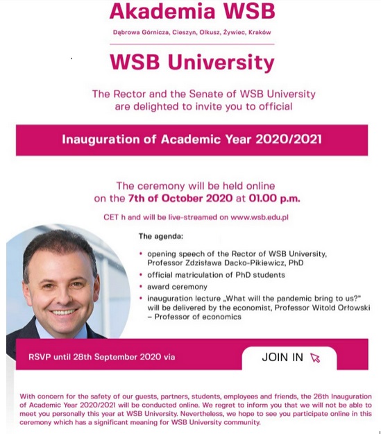 Invitation to virtual Inauguration of Academic Year 2020/2021 at WSB University (Poland)- 7th October 2020